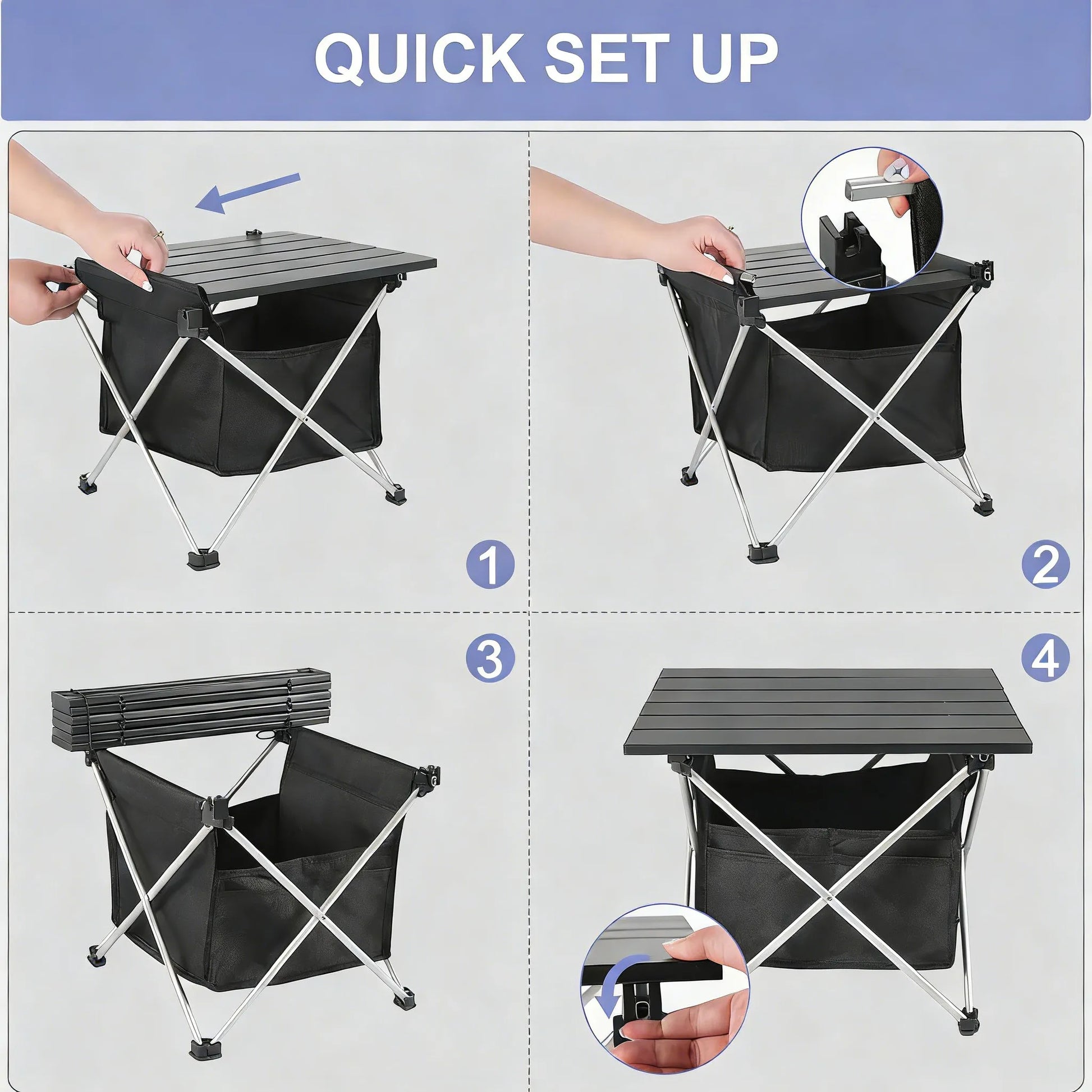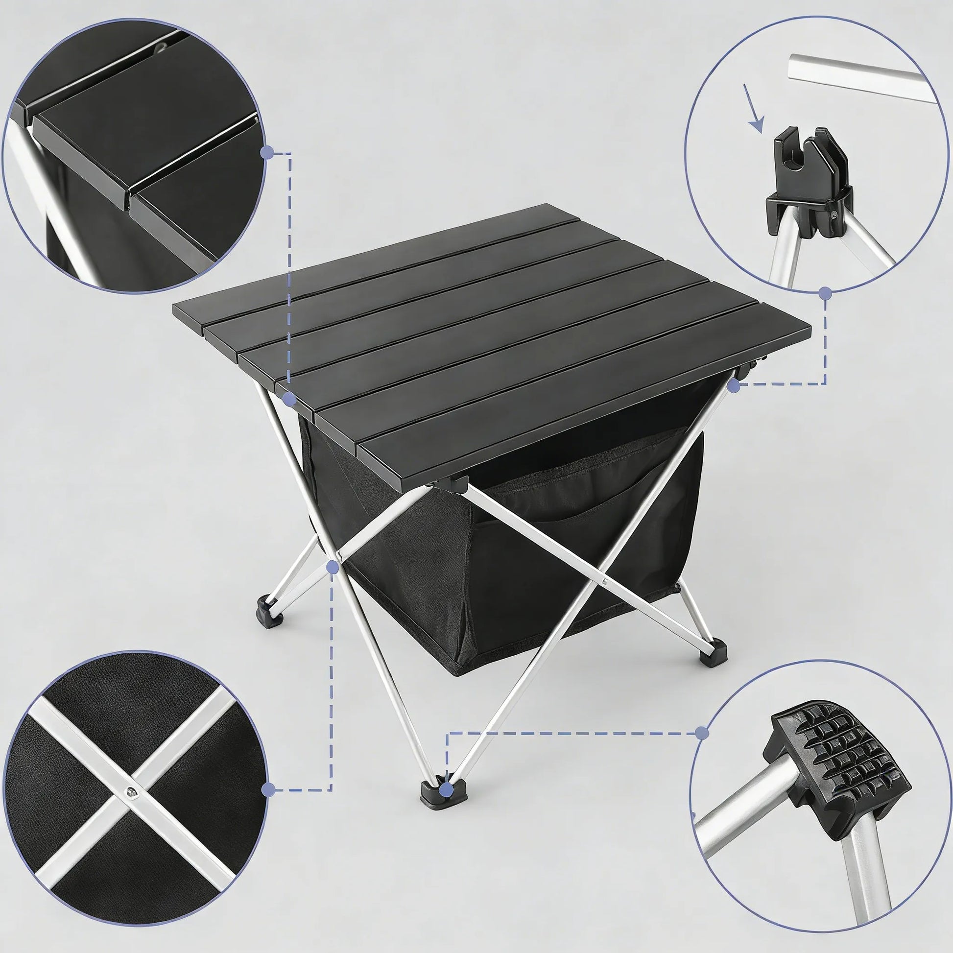 Durable and Stable Construction – Made from heavy-duty aluminum with non-slip foot caps that prevent legs from folding, bending, or collapsing. Stays steady on varied terrain without tipping. The triangular frame and reinforced joints support up to 55 lbs, providing dependable performance for picnics, cooking, and outdoor dining.